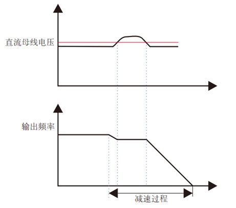 在減速過程中,當直流母線電壓超過設定值時,會根據你選擇的過壓保護模式保護變頻器。